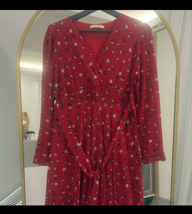 Uzun, bol kesim kadın elbisesi, koyu kırmızı renk ve baskılı bohem deseniyle Paris tarzını yansıtıyor.