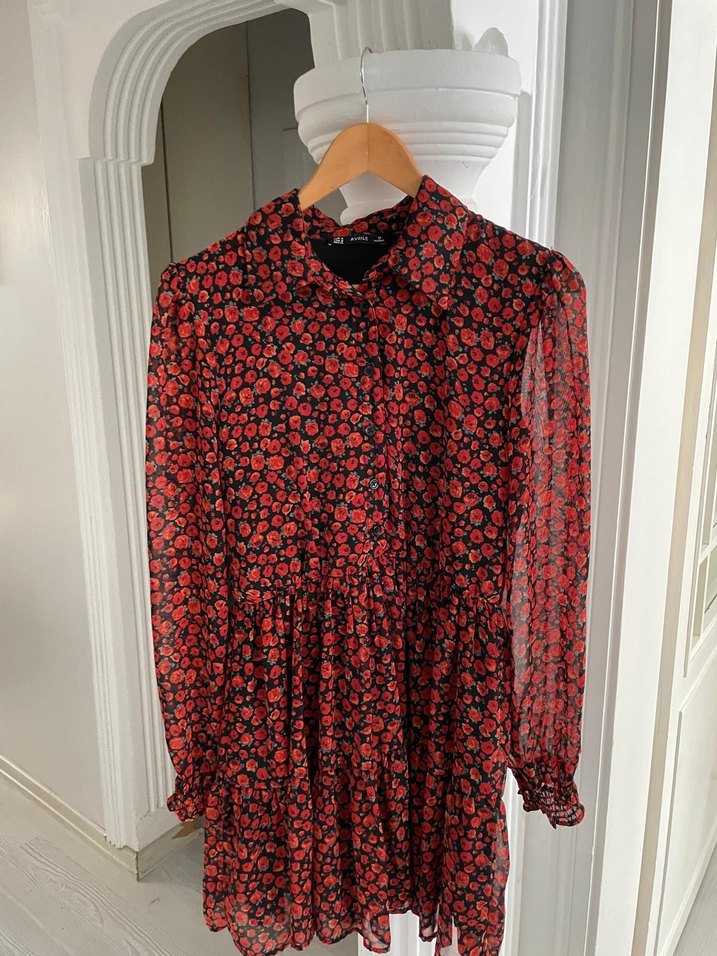 Kırmızı bohem tarzda, uzun kollu, yakalı ve düğmeli midi elbise. Sentetik kumaştan, bol kesim ve koyu renkli çiçek desenli.