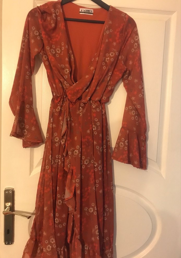 Bohem tarzda, uzun kollu ve V yaka, bol kesim uzun elbise. Sentetik kumaştan, kırmızı koyu tonlarda batik desenli, drapeli tasarım. Romantik akşamlar için uygun.