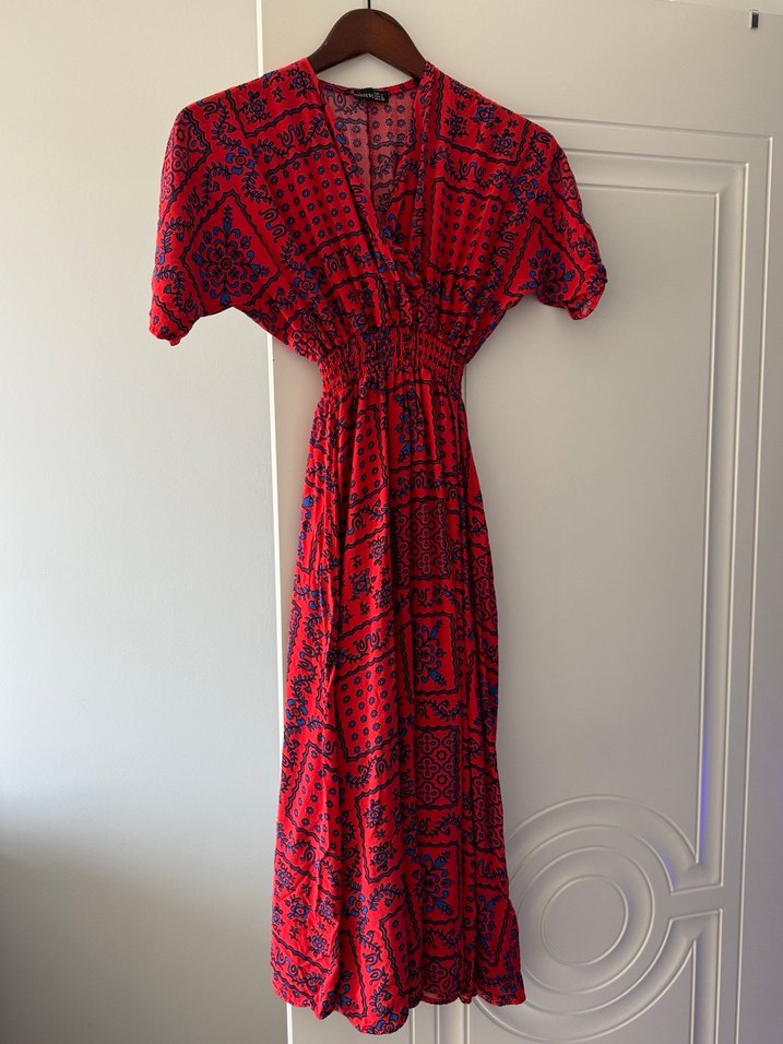 Renkli kırmızı uzun elbise, kısa kollu ve V yakalı bol kesimdedir. Drapeli tasarımı ve batik deseni bohem tarzını yansıtır. Yumuşak sentetik kumaştan üretilmiştir.