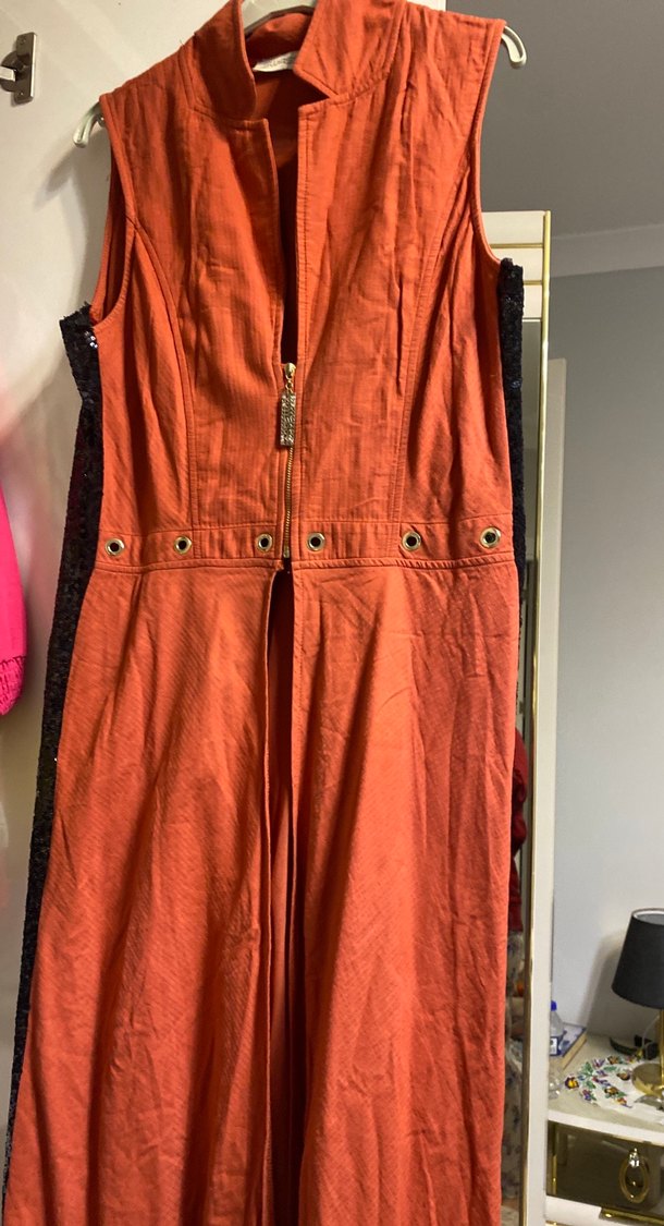 Fermuarlı, kolsuz, uzun ve dar kesim bu elbise, kırmızı parlak kumaştan yapılmış ve yakasında çentikli yaka bulunur. Vintage bohem tarzını yansıtır. ✨ XL beden yazıyor fakat L bedene daha uygundur iki koltuk arası 44 santim boyu 135 santimdir