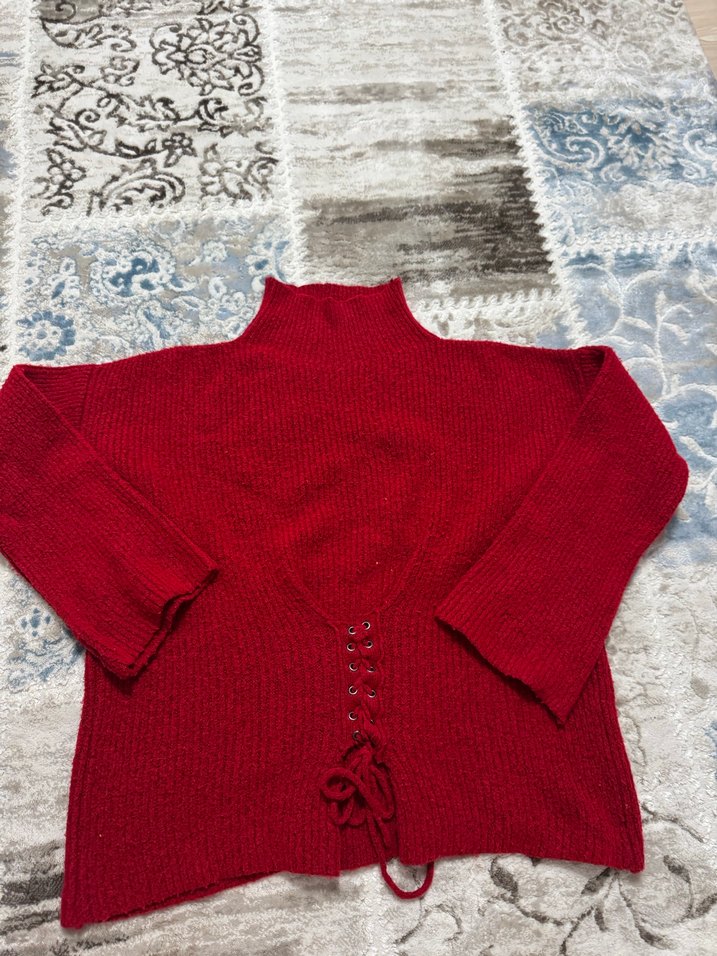 Kırmızı renkte, yüksek yakalı ve uzun kollu örme kadın kazak. Bohem tarzda, bel kısmında bağcıklı detay bulunur. Günlük kullanıma uygundur.