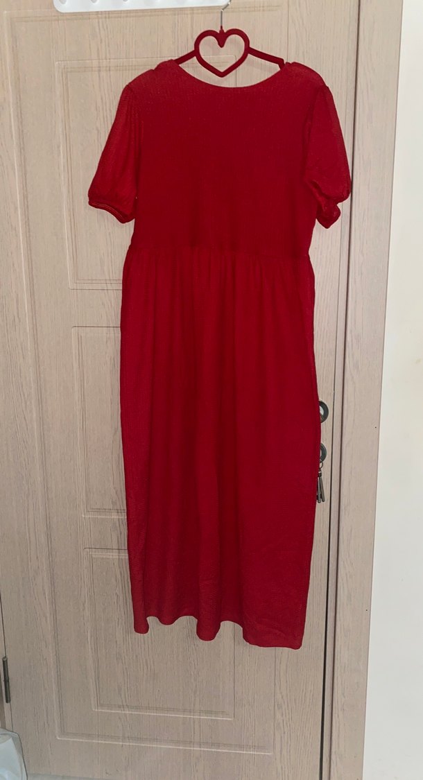Koyu kırmızı renkli, kısa kollu ve bol kesim, dökümlü detaylı uzun elbise. Nefes alan keten kumaştan, bohem tarzı için ideal. Kollar lastikli. Sırt detayı mevcut. New look marka. Gebelik döneminde kullanmaktan keyif aldığım ürünlerden biriydi