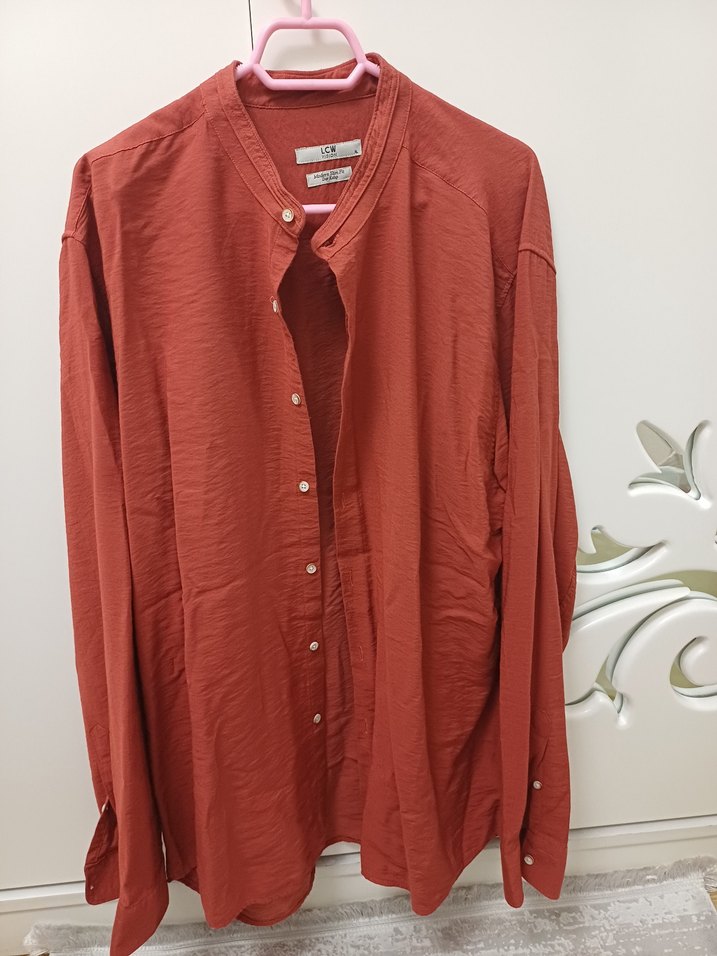 Kırmızı parlak keten kumaştan, bol kesim ve uzun kollu erkek gömleği. Düğmeli ve çıtmalı yakasıyla günlük kullanıma uygun, rahat bir modeldir.
