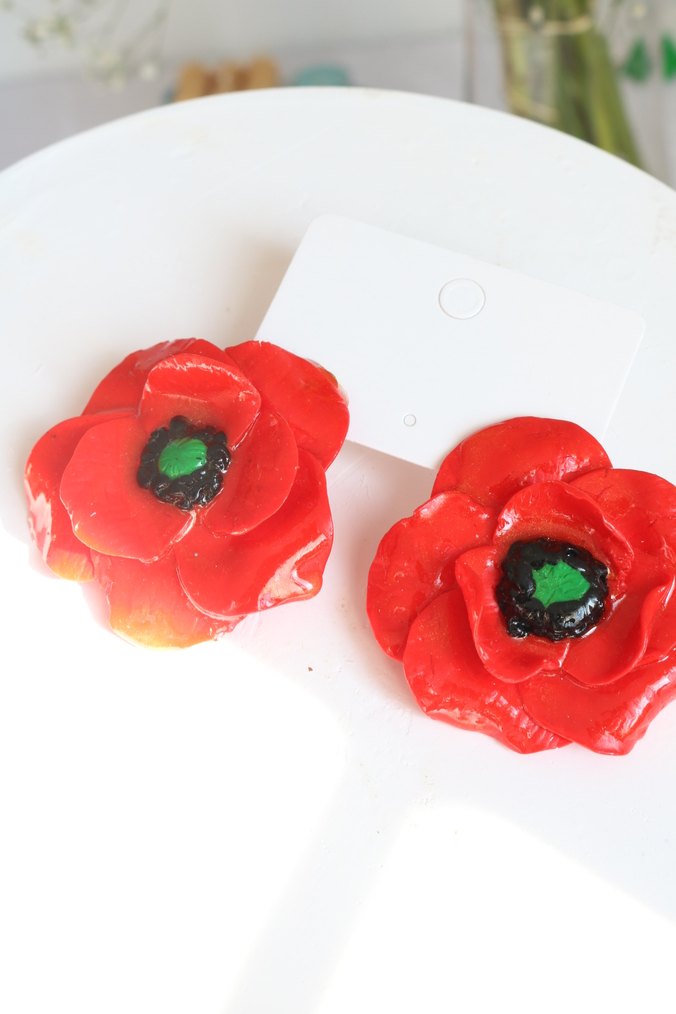 Kırmızı çiçek şeklinde, boncuk detaylı, pop kültür tarzında, romantik akşamlar için uygun küpeler. Bohem ve avangart stillere uyumludur.