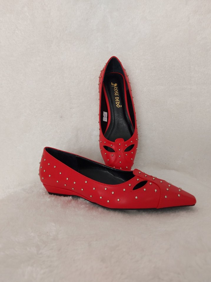 Kırmızı renkte, boncuk detaylı ve dolgu topuklu kadın babetler. Romantik akşamlar için cesur ve gösterişli bir tercih.