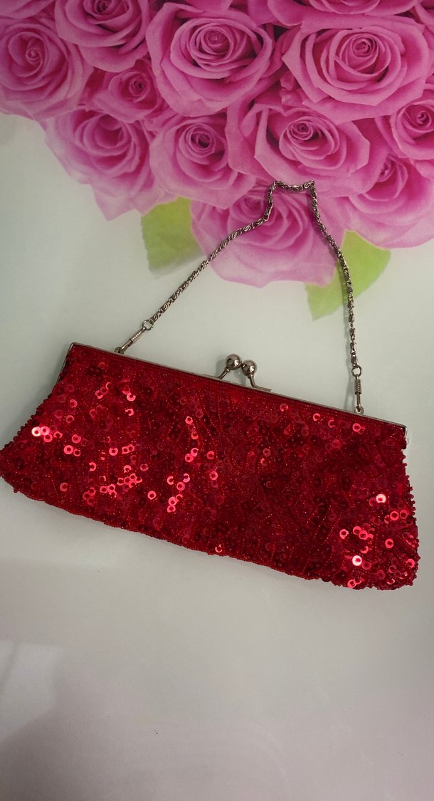 Kırmızı boncuk işlemeli ve nakış detaylı, sentetik kumaştan abiye çanta. İnce zincir sapıyla dikkat çeker, parti kombinlerine uygundur.