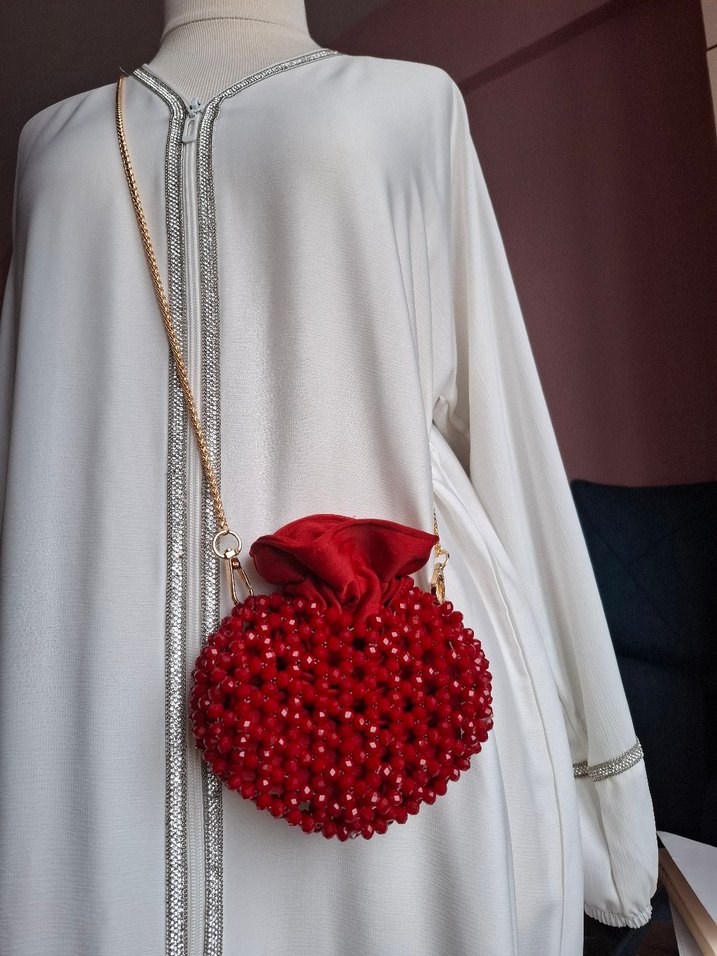 Kırmızı boncuk işlemeli, sentetik kumaştan yapılmış kadın çantası. Altın zincir askılı ve büzgülü üst kısmı ile düğünlere uygun.