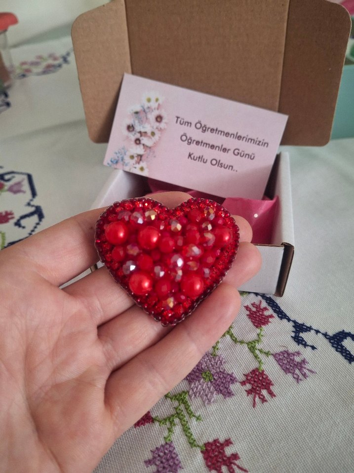 Parlak kırmızı kalp şeklinde boncuk işlemeli broş, bohem ve vintage tarzı yansıtır. Öğretmenler Günü mesajı içeren kartla birlikte gelir. ❤️