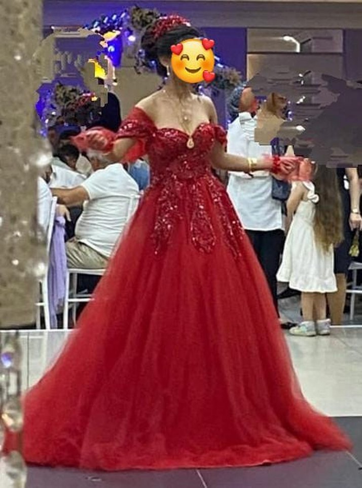 Kırmızı Boncuk İşlemeli Uzun Abiye Elbise