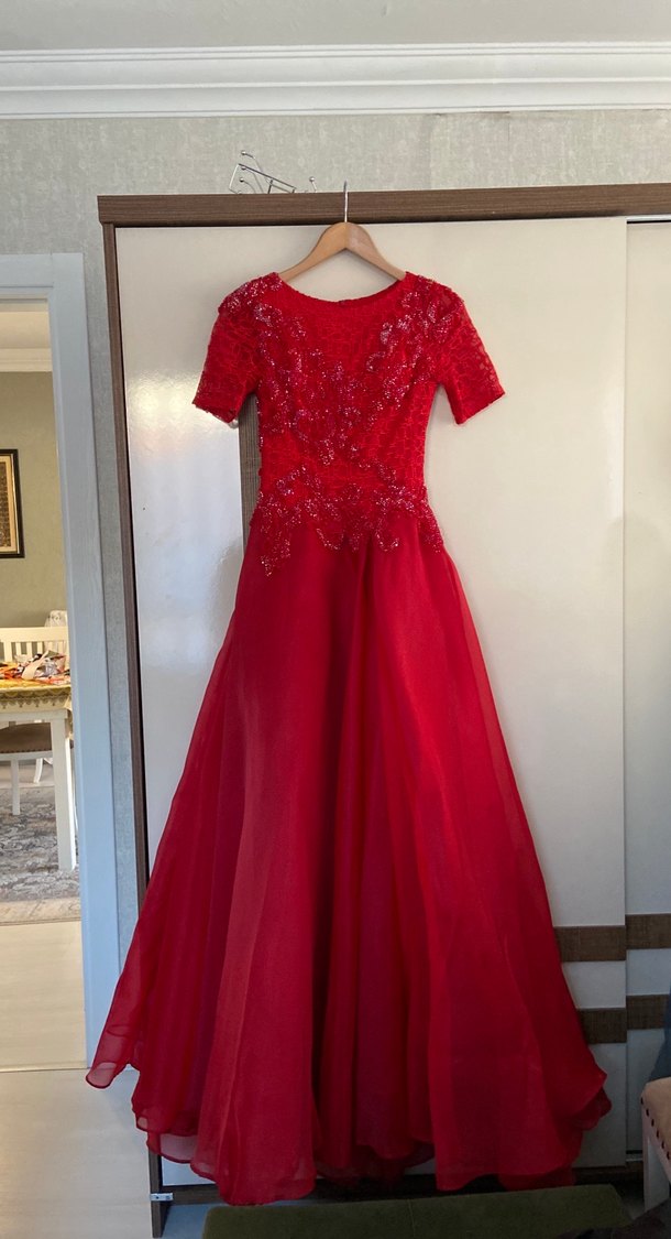 Kırmızı uzun abiye elbise, kısa kollu.