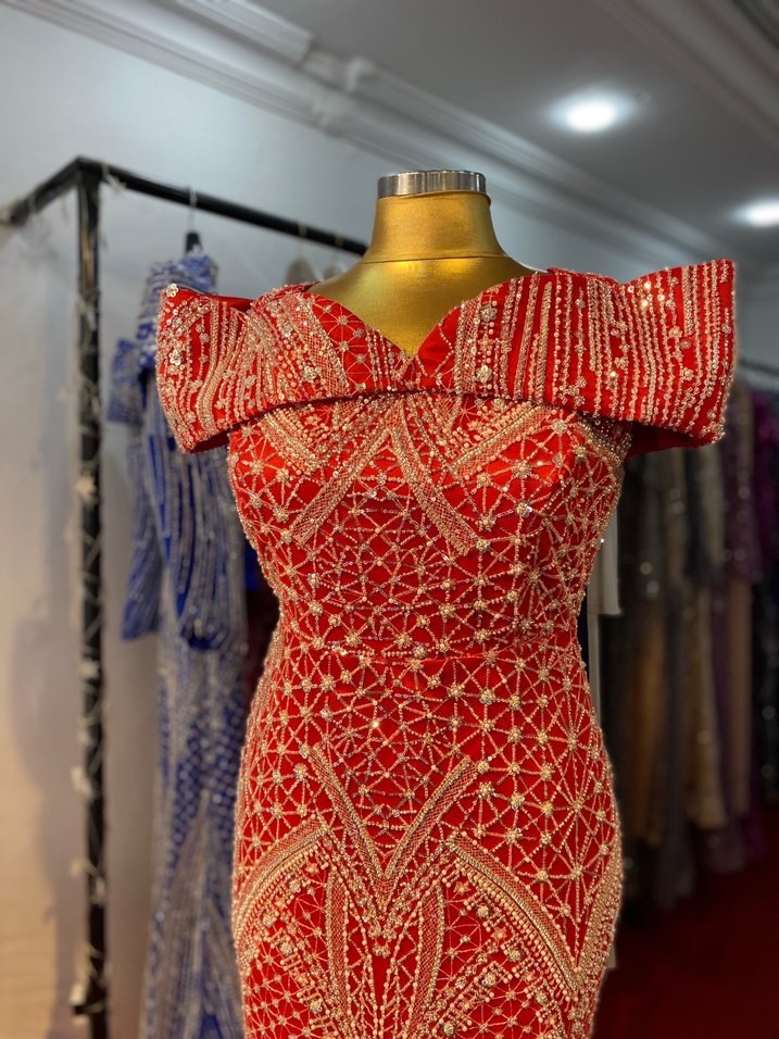 Kırmızı Boncuk İşlemeli Uzun Kadın Abiye açık abiye Kiralıkürün