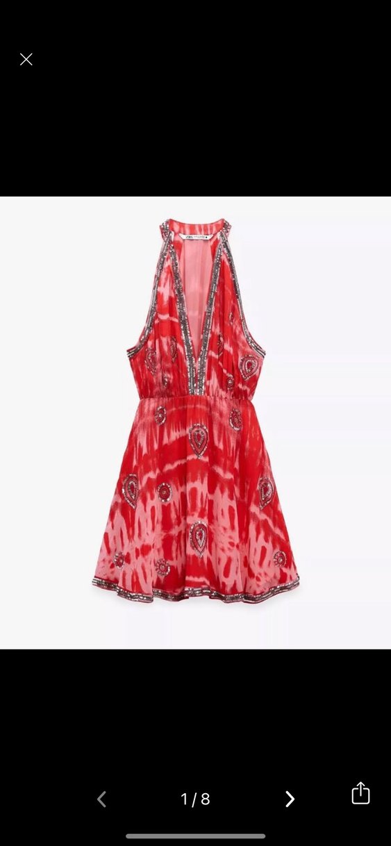 Kırmızı, boncuk işlemeli V yakalı, renkli batik desenli, salaş kesim mini elbise. Yumuşak sentetik kumaştan, romantik akşamlar için uygun.