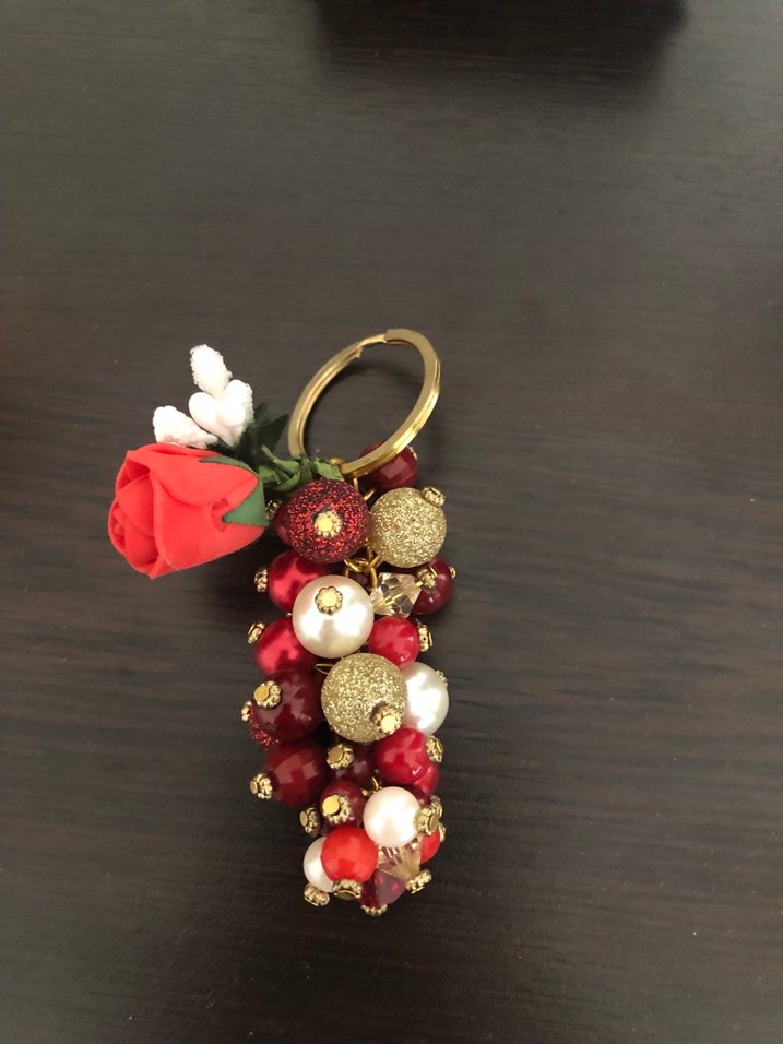 Kırmızı gül ve renkli boncuklarla süslenmiş bohem tarzda anahtarlık, retro ve göz alıcı bir görünüm sunar 7ccm. Hiç kullanılmdı