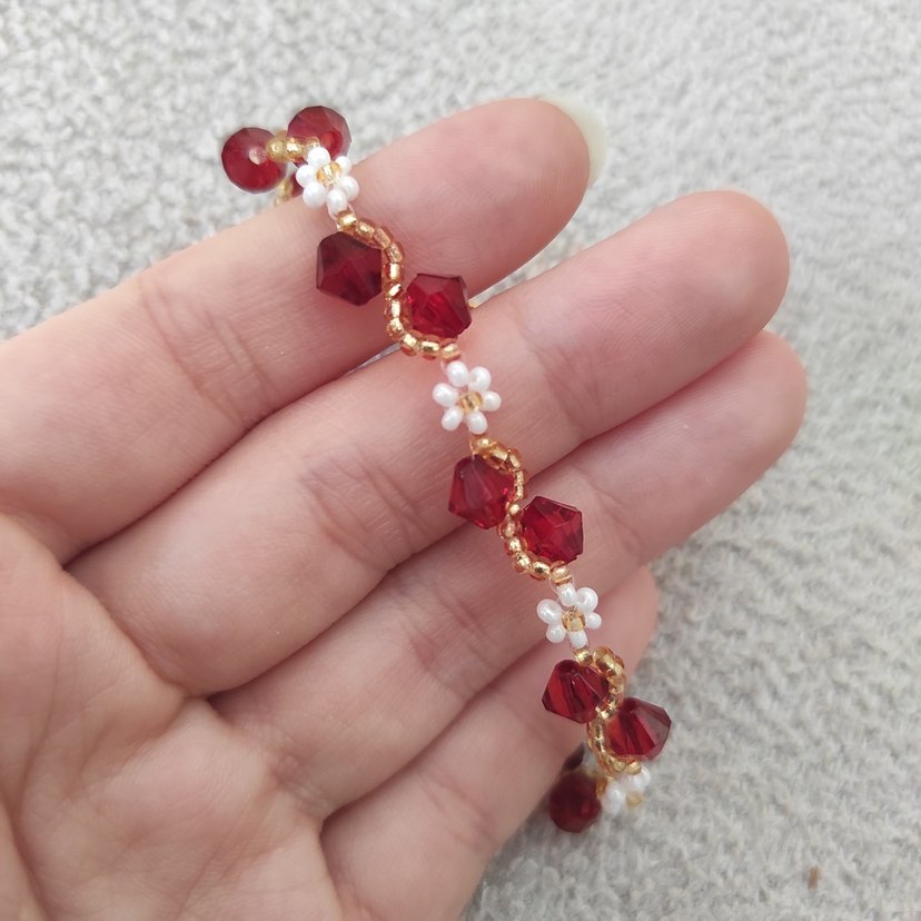 Canlı kırmızı boncuklar ve küçük işlemeli beyaz çiçekler ile bohem tarzda, düğünlere uygun bileklik. Kendim yapıyorum. Bilek ölçünüzü verirseniz yapabilirim.