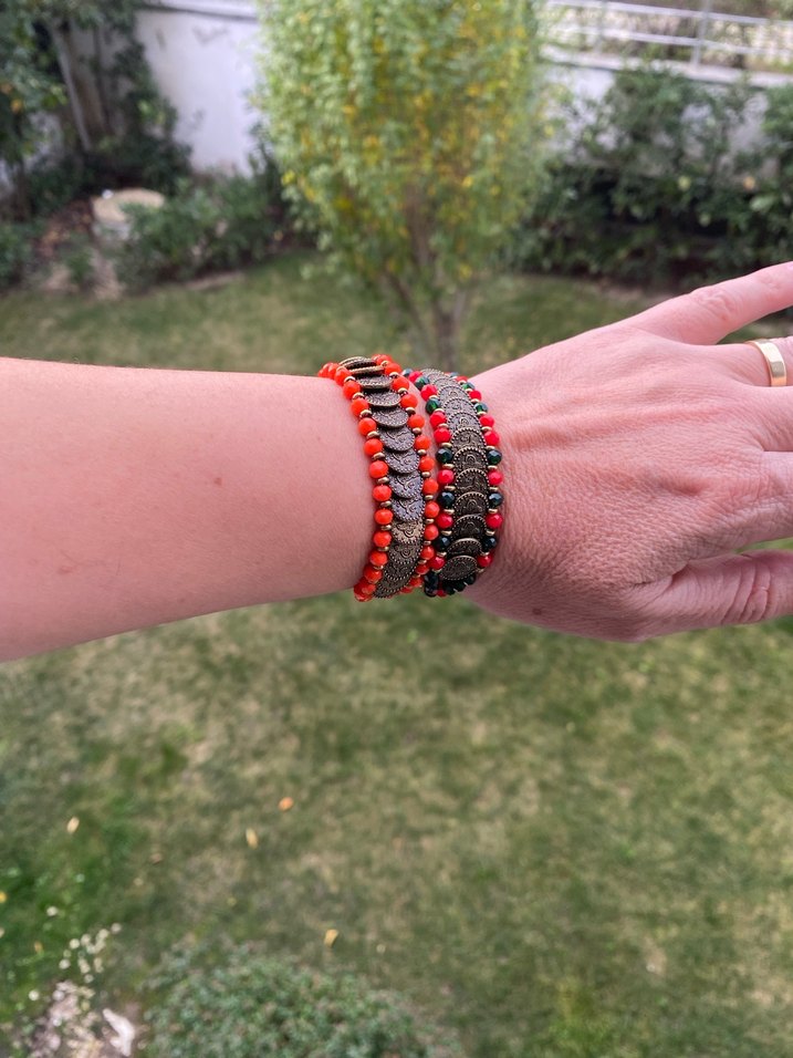 Canlı renklerde kırmızı boncuklar ve yılan desenli detaylara sahip, bohem ve retro tarzda kadın bileklik. ADET FİYATLARI 200 TL