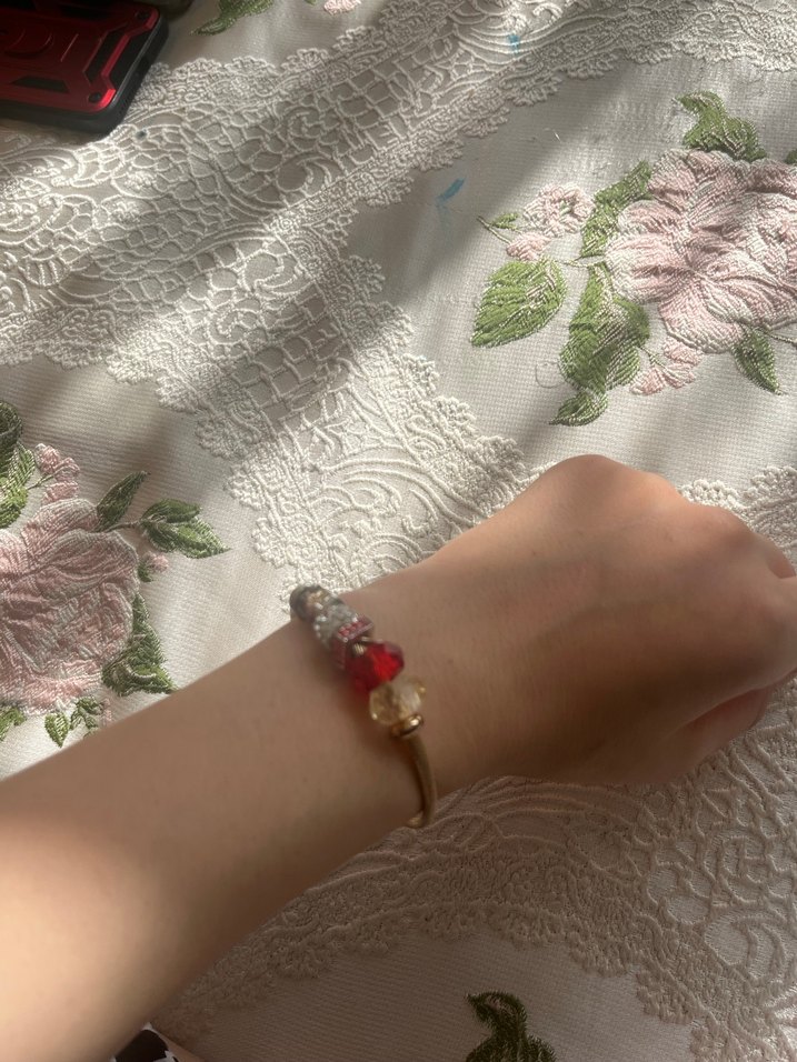 Kırmızı ve şeffaf boncuklarla süslenmiş bohem tarzda kadın bileklik, günlük kullanıma uygun hafif ve zarif tasarım.