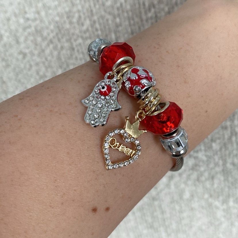 Kırmızı ve gümüş boncuklar ile desenli, kristalli kalp ve hamsa figürlü bohem tarzda bileklik. Günlük kullanıma uygundur.