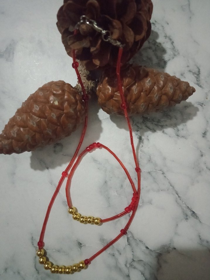 Kısa uzunlukta, kırmızı boncuklar ve altın detaylar içeren, minimalist bohem tarzda günlük kullanım için uygun kadın kolyesi ve bileklik