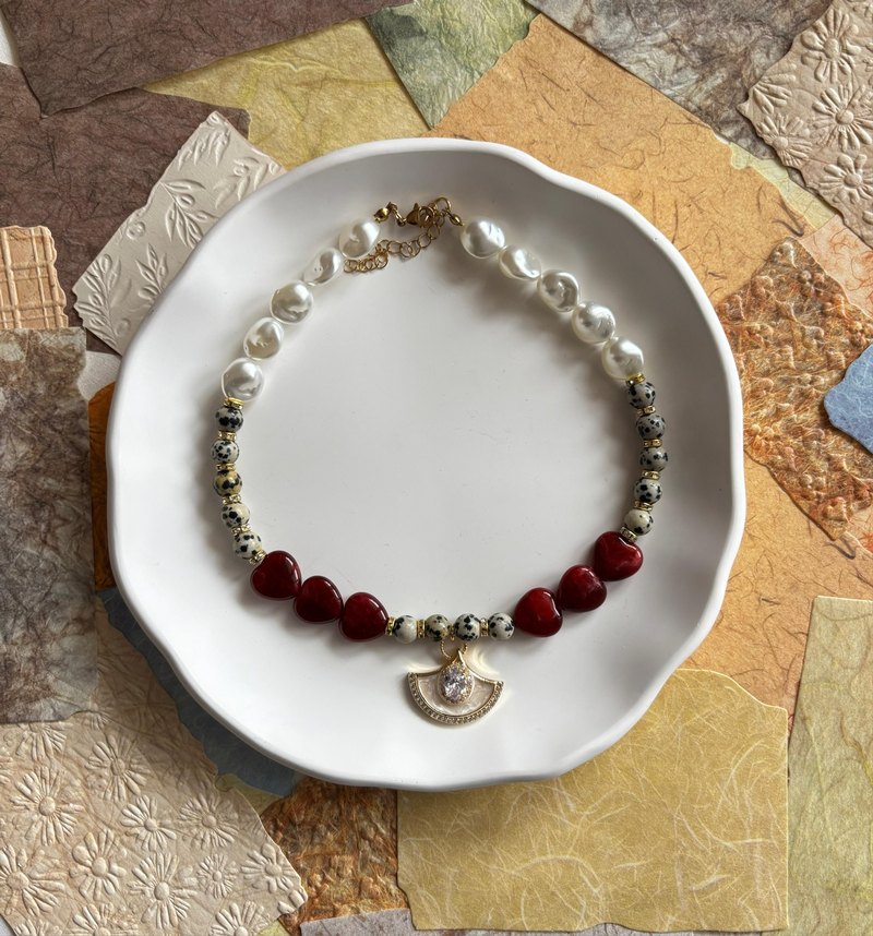Kırmızı kalp şeklinde boncuklar, beyaz yuvarlak boncuklar ve taşlı dekoratif bir figür içeren kısa boy bohem ve şık kolye. ❤️