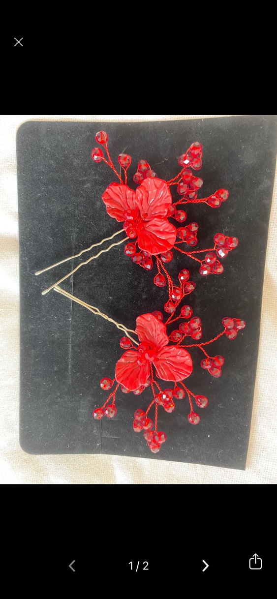 Koyu kırmızı boncuklu, plastik çiçekli bohem tarzda, göz alıcı ve yenilikçi saç tokası.