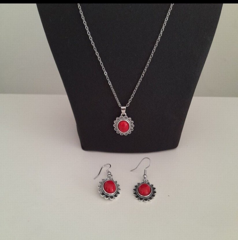 Kırmızı boncuklu ve etnik desenli, bohem tarzda kolye ve küpe seti, günlük kullanıma uygundur.