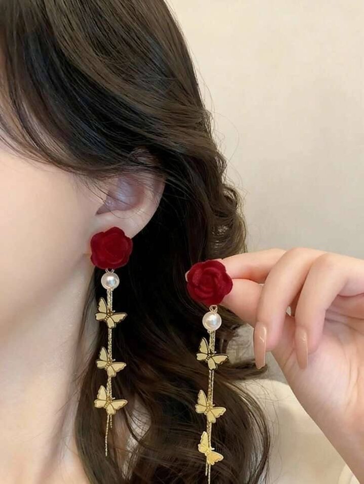 Boncuklu kırmızı çiçek detaylı, inci ve altın renkli kelebekli, midi uzunlukta bohem küpeler, düğünler için uygun.