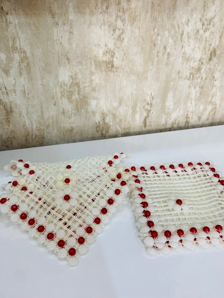 6 Adet Sunumluk dekoratif peçete Kırmızı boncuklarla süslenmiş beyaz el örgüsü masa örtüsü, geleneksel bir dokunuş katıyor.