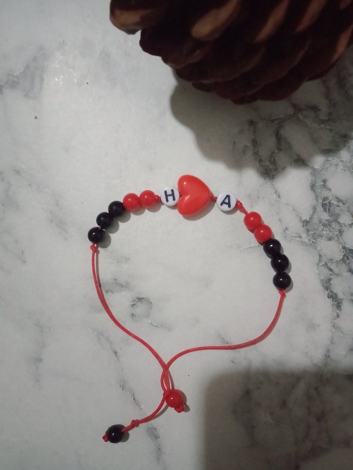 Kırmızı ve siyah boncuklardan oluşan, kalp figürlü ve harf detaylı minimalist bohem tarzda kadın bileklik. ❤️