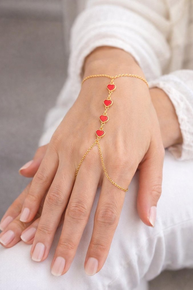Renkli bohem tarzda, kırmızı boncuklu kalplerle süslenmiş kadın el zinciri, günlük kullanım için uygundur.