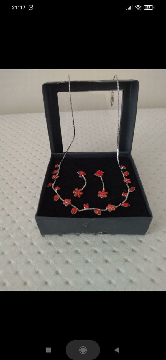 Koyu kırmızı boncuklar ve çiçek desenli baskılarla kadın takı seti, kolye ve küpelerden oluşur. Düğün ve bohem tarzına uygundur.