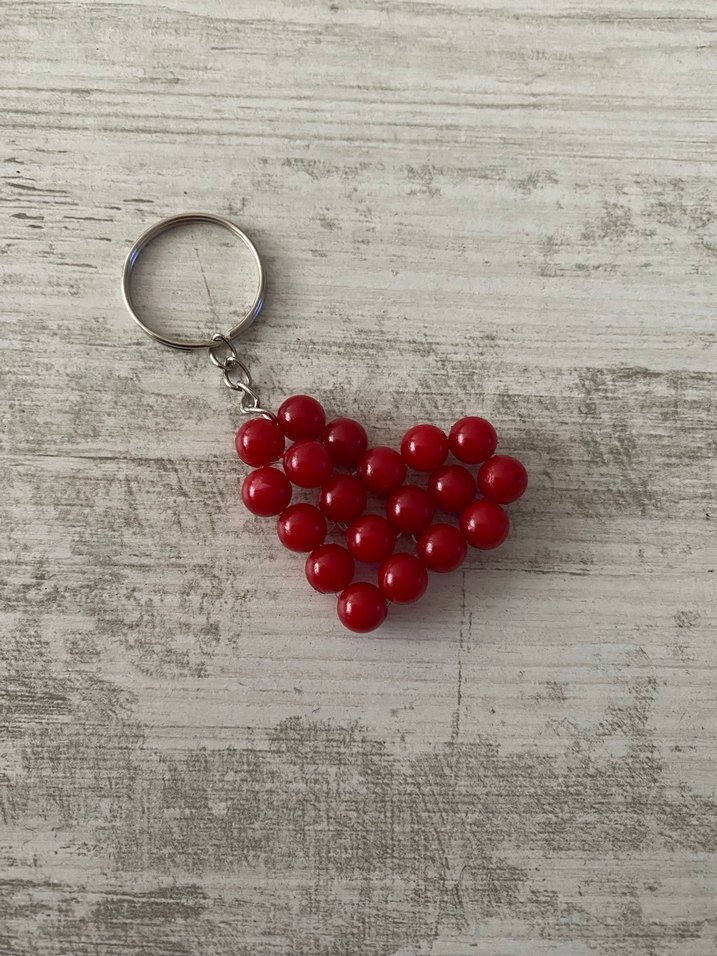 Kırmızı boncuklardan yapılmış kalp şekilli anahtarlık, bohem ve retro tarzlara uygun minimal bir tasarıma sahiptir.