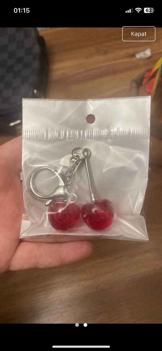 Parlak kırmızı boncuklu kiraz şeklinde, minimalist rock punk tarzında anahtarlık. Hafif asi bir dokunuş için uygun.