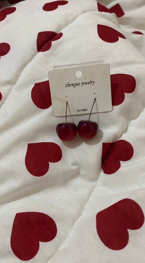 Kırmızı boncuklu, kiraz şeklinde minimalist ve renkli küpeler. Romantik akşamlar için uygun, Zhenguo Jewelry markalı.