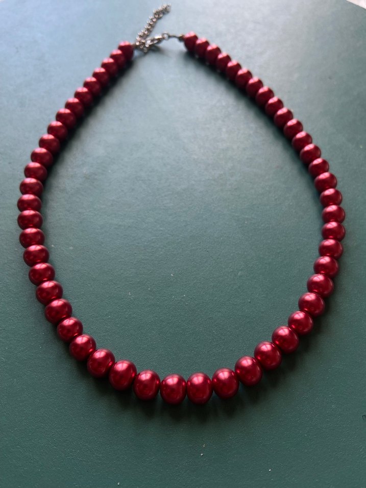 Bohem tarzda, normal uzunlukta kırmızı boncuklardan oluşan renkli midi kolye, romantik akşamlar için uygun.