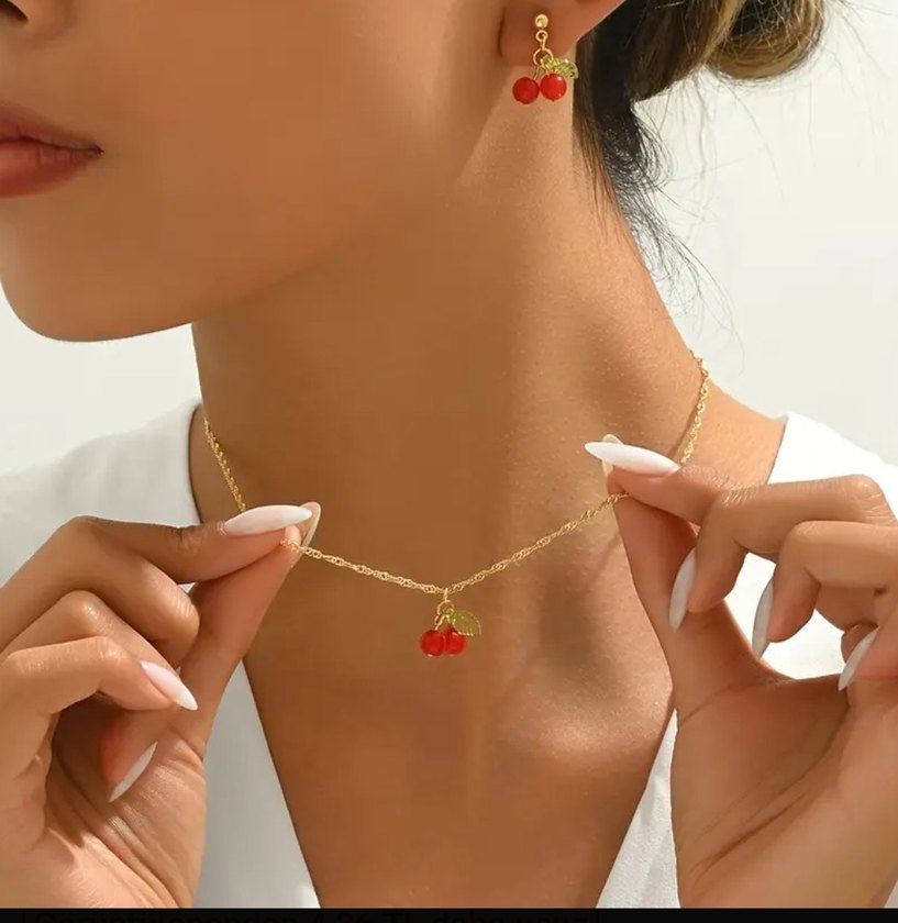 Kısa ve minimalist tasarımlı bu kolye, ince altın zincir üzerinde kırmızı boncuklu kiraz detaylarına sahiptir, romantik akşamlar için uygundur.