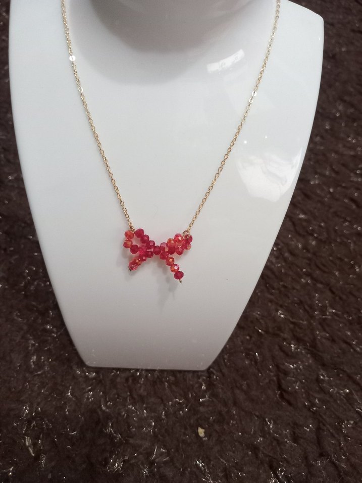 Kırmızı boncuklarla işlenmiş küçük fiyonk şeklinde, kısa ve minimalist bohem tarzda bir kolye. Romantik akşamlar için uygun.