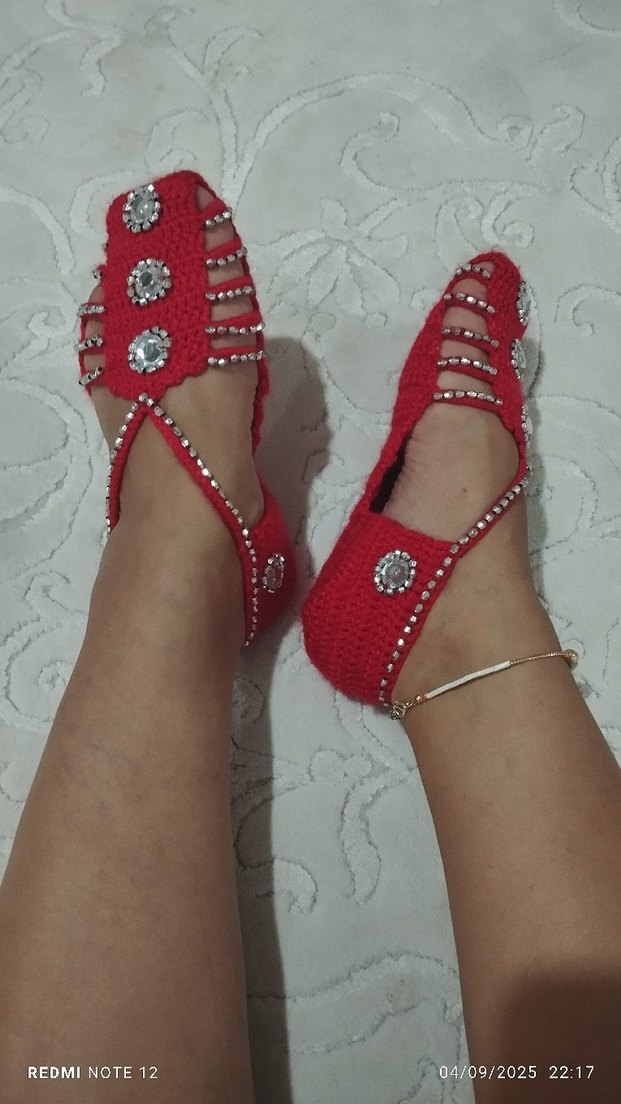 Kırmızı örgüden yapılmış, boncuk ve taş detaylı stiletto topuklu terlik. Renkli ve rahat, günlük kullanıma uygun.
