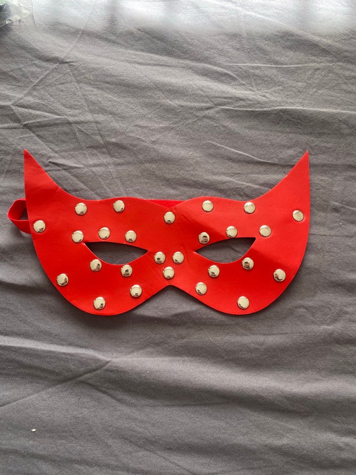 Kırmızı, boncuk detaylı kadın uyku maskesi. Rock punk tarzında, renkli ve avangart tasarıma sahip.