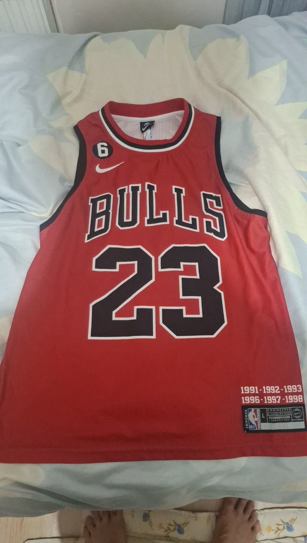 Kırmızı, Bulls baskılı, 23 numaralı, düğmeli, bisiklet yaka, kolsuz basketbol forması. Fitted kesimle spor tarzını yansıtıyor. 23 yazisinin altinda 1cm yurtik var baska sorunj yok