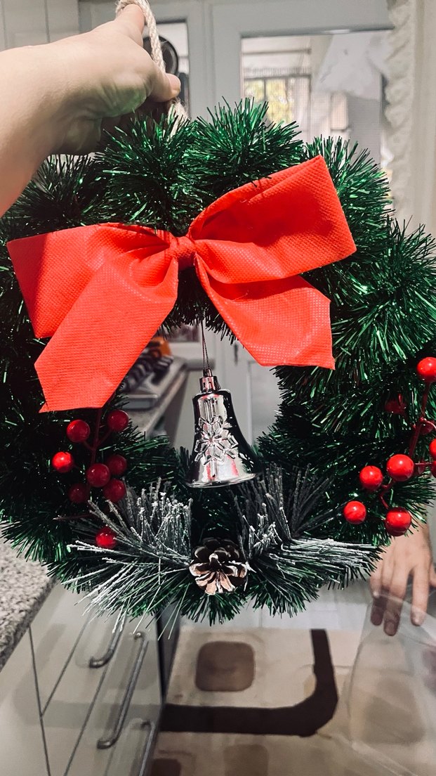 Yeşil çam dalları, kırmızı meyveler, büyük kırmızı fiyonk ve gümüş çan süsü bulunan Noel çelengi.