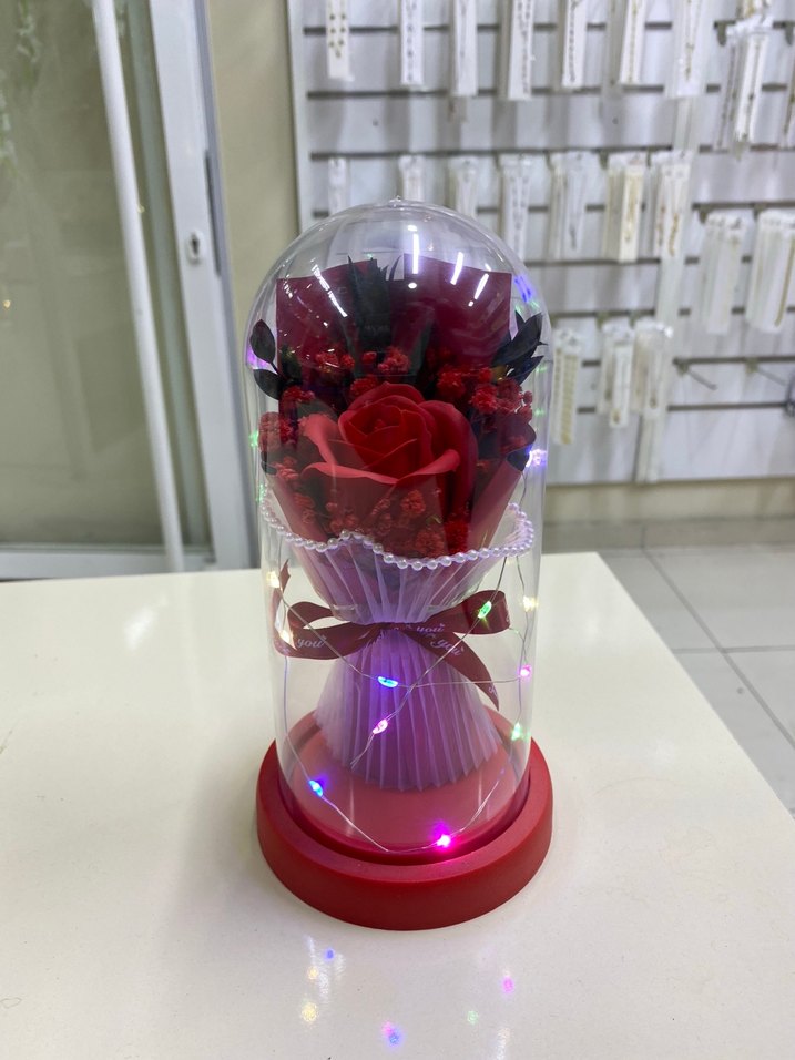 Kırmızı tabanlı cam fanus içinde renkli yapay güller, küçük ışıklar ve kurdele ile süslenmiş ev dekorasyonu için uygun bir parça .