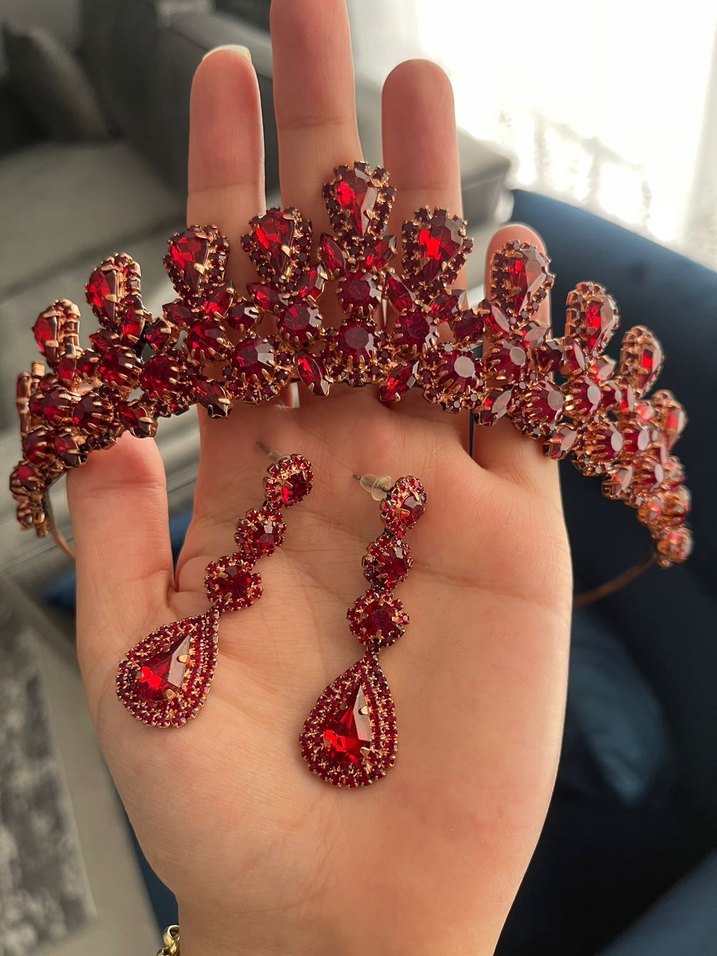 Koyu kırmızı cam taşlarla süslenmiş, ışıltılı taç ve damla küpelerden oluşan set, göz alıcı ve şık bir görünüm sunar. ✨