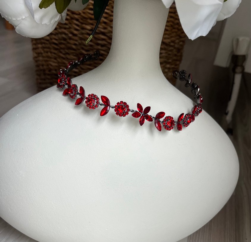 Kırmızı cam taşlar ve payetlerle süslenmiş, çiçek ve dairesel desenlerde modern kadın saç aksesuarı. Bohem, hippie ve retro tarzlara uygundur.