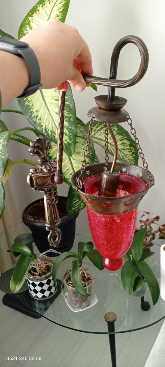 Koyu metal çerçeveli, detaylı klasik avize lambası, canlı kırmızı camlı ve vintage bir hava katıyor.Pirinç duvar avize