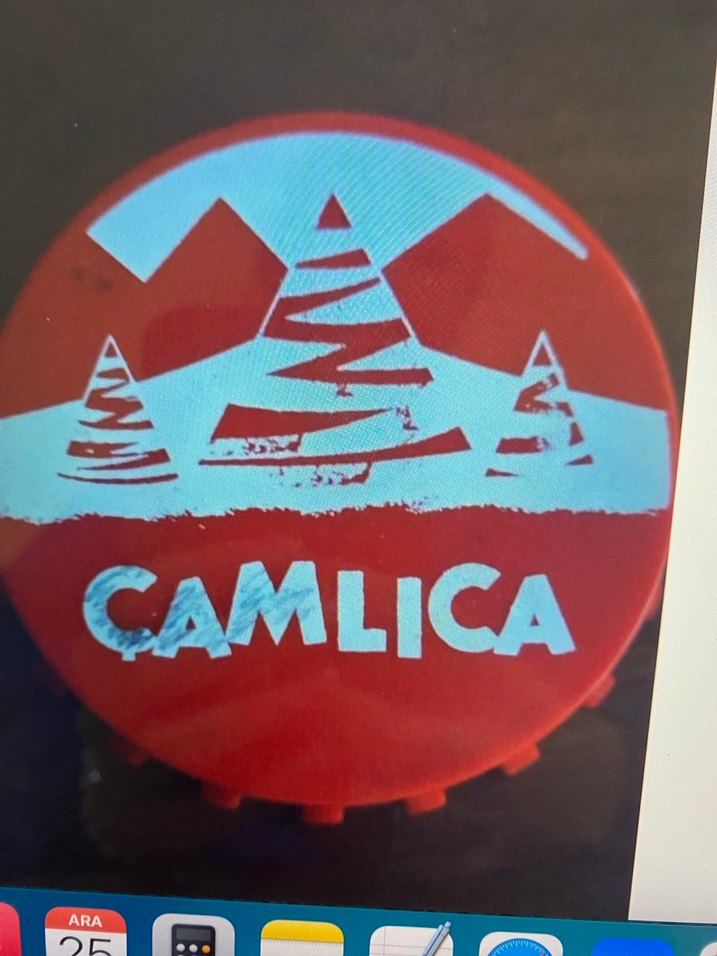 Canlı kırmızı renkte, vintage dağ tasarımlı ve 'CAMLICA' yazılı, rock punk havasında renkli bir rozet.