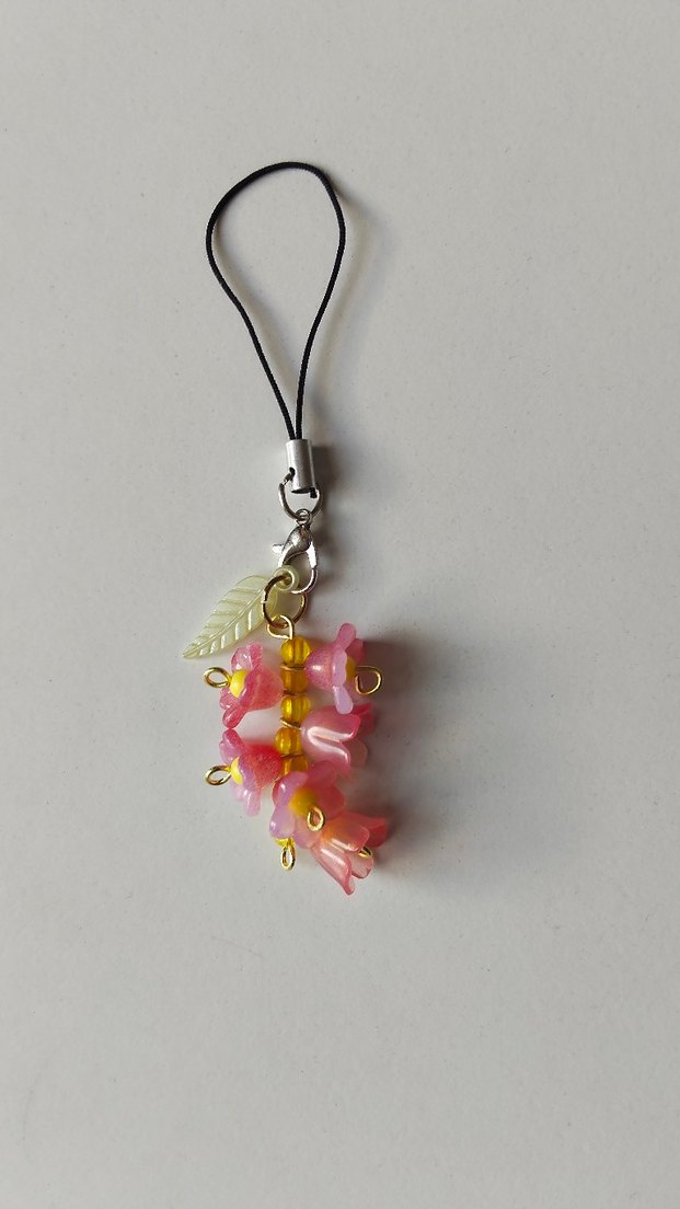 Pembe renkli, çiçek şeklinde boncuklardan oluşan ve küçük yaprak detaylı, bohem ve minimalist tarza uygun kadın charm.