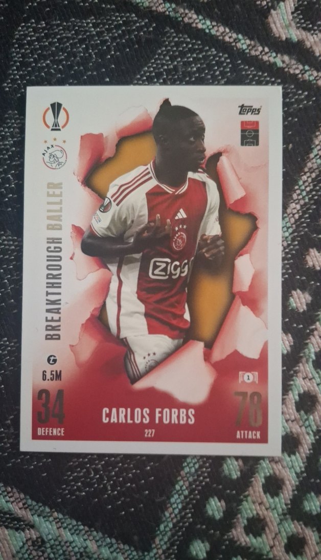 Bu kırmızı rozet, Carlos Forbs'un hareketini gösterir ve saldırı ile savunma istatistiklerini vurgular. Canlı pop kültür tarzında, 6.5M değeri ve 227 numarası bulunur. ⚽