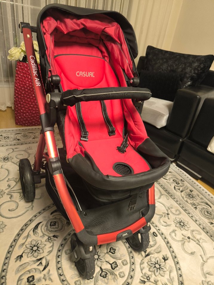 Canlı kırmızı renkli, emniyet kemerli rahat oturaklı ve sağlam yapılı CASUAL marka bebek arabası. Puseti ile beraber gönderilecektir.