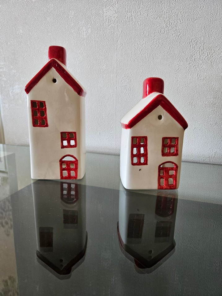 Kırmızı çatılı ve pencereli iki beyaz ev biblosu. Minimalist tasarımıyla mekanlara şirinlik katar.